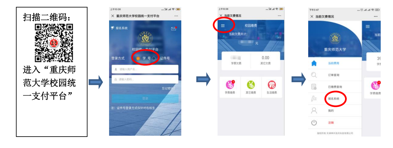 电 脑 客 户 端 登 录 : 登 录 网 址https://cwcwx.cqnu.edu.cn/xysf/publish/index.aspx,进入51u娱乐通用报名系统;点击右上角“登录”按钮,学生用户名为学号,教师用户名为工号,密码为身份证后六位;选择“普通话水平测试”进行报名,报名成功后再缴费。
