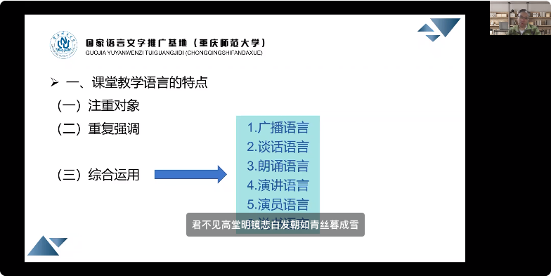 王于飞教授以“古典诗词诵读指导”为主题,讲述了古典诗词诵读的指导,强调了朗诵和诵读在普通话学习中的重要性,指出朗诵和诵读不仅是技术层面的学习,更是道与技的双修。在学习和训练过程中,需要关注普通话的发音技巧、发音能力和方法,以及语言品质的塑造。同时,还强调朗诵作品感染力和表现力的培养,以及朗诵者在诵读作品前后的妆容服饰搭配,鼓励同学们在诵读过程中,将白纸黑字的文字转化为具有感染力、表现力和征服力的语言表达,并融入自己的理解和感受。