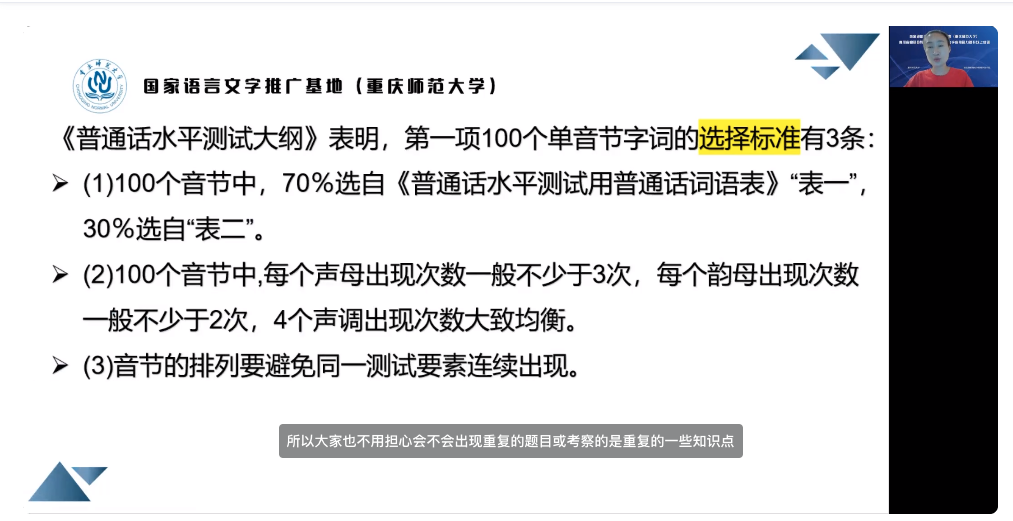 朱怀教授的授课内容为“普通话多音节词”,主要讲述了普通话水平测试中的评分标准,包括语音错误、语音缺陷等;还通过范例讲解了如何进行普通话水平测试,包括平舌音和翘舌音的区别、轻声变调化等内容,并进行了相关的练习。