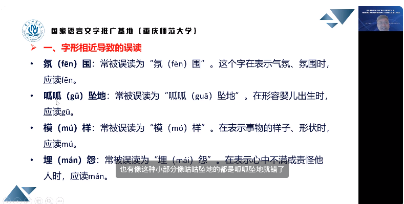 雷冬平教授以“容易读错的字词发音及纠错训练”为主题,对方言与普通话差异的对比分析和方言读音纠错训练进行了全面讲解。还强调了方言保护的重要性,避免方言的消失和文化的同质化。